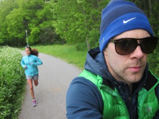 Idag hade jag sällskap av min sambo på cykel. Det är väldigt bra med cyklande sällskap, för då kan han cykla före och plinga när gångarna går i bredd på stigen och så slipper jag skrämma dom när jag kommer upp i rygg. Han kan också ha dricka i cykelkorgen och så vara fotograf förstås. Jag springer ytterst sällan med telefon eller kamera, vill helst slippa bära på någonting när jag springer, därför är det svårt att få till löparbilder till bloggen, men idag så!