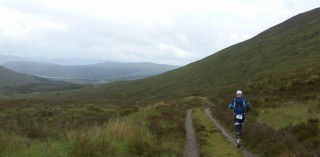 Alla löpare får två minuters stopp i T2A för att man ska kunna kolla att all obligatorisk utrustning finns med. Elses utrustning är redan avcheckad och medan min utrustning kollas passar jag på att byta ut mina korta tritajts som är fuktiga och har börjat skava lite mot ett par trekvartstajts som är optimerade för ren löpning. Samtidigt fyller Skåningen på mitt vätskebälte med Coca Cola - nu är det koffein och ren energi som gäller för att ta sig in i mål så effektivt det bara går. Jag har bara fyra flaskor om 16 cl men räknar med att jag kan fylla vätska i fjällbäckarna om det behövs, för nu bär det av uppåt. Vi har två-tre kilometers vandring uppåt framför oss, det är niohundra höjdmeter som ska avverkas på den sträckan och jag tror inte jag hade tagit många löpsteg här ens om jag varit helt utvilad - det blir en strävsam och metodisk promenad uppåt. Ändå plockar jag fortsatt placeringar. Det går tungt men det går bra, jag känner mig stark och manar fram bilden av en evighetsmaskin som kan mata på och mata på och mata på i all oändlighet. Jag sätter tempot och Else följer lätt bakom mig, pratar oberört på och jag försöker hänga med i konversationen - det funkar perfekt för att mota negativa tankar innan de ens har funderat på att dyka upp. Understundom stannar vi upp och beundrar utsikten ner över River Torridon, Loch Torridon, alla bergen och så alla bilarna som glittrar på allt längre ävstånd nere i T2A.