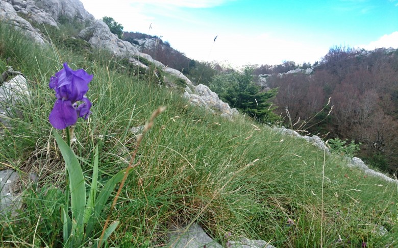 Vid 1300 meter viker jag in på en mindre led som ska ta mig raka vägen mot huvudtoppen Sveti Jure. Här är ledmarkeringarna lite eroderade och svårare att se. Samtidigt är jag inne i molnen och sikten minskar, och dessutom flackar stigningen ur och det blir lite lurigt att orientera sig. Jag får stanna upp och kolla kartan så jag är säker på att den lilla stig i högt gräs jag nu följer faktiskt är rätt. Jag fortsätter en bit till, molnen skingras och jag hittar åter de trygga ledprickarna. Det är en kilometer till den sista stigningen mot toppen och leden går upp, ned och längs skarpa kalkstensryggar, bitvis i höglänta skogsmarker och bitvis i karga barblåsta stenpartier. Inte lättlöpt men det funkar ändå med lite försiktighet.
