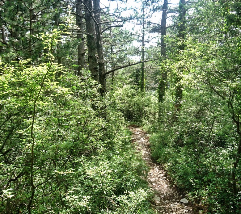 Första 350 höjdmeterna upp till Veliko Brdo är dock asfalt med korta avbrott för grov grusstig. Jag tar höjd skapligt aggressivt där det är lättlöpt och det är bara drygt tjugo minuter in i passet när jag lämnar den höglänta byn bakom mig och fortsätter de välpreppade serpastigarna upp upp upp i bergsmassivet. Det är egentligen först någonstans kring 1000 höjdmeter som stigen blir lite knagglig. Leden följer en ravin upp bakom berget Stropac och på några ställen är det bara stenskravel i brant vinkel att forcera. Men det är förhållandevis korta partier och snart är jag uppe på fint stigunderlag igen. Molnen ligger på 1100 meter och det är ganska skönt att komma in i skuggan.