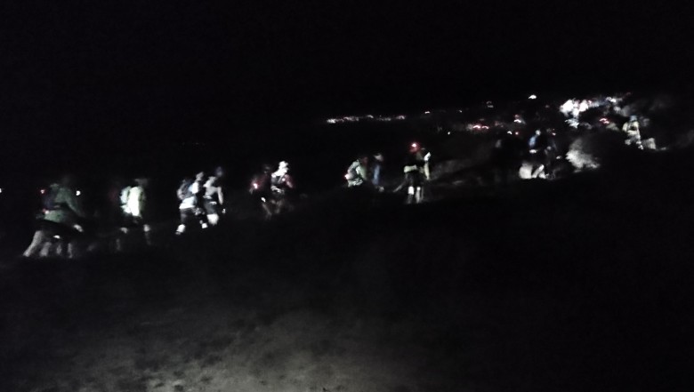 Uppladdningen på plats har varit bra, bor med familjen nära målområdet, fixat nummerlapp och parapernalia, drop bag incheckad och efter en låååång bussresa till norra änden av ön byggs stämningen upp i en trång gränd i Puerto de las Nieves. Spansk rap och en extatisk speaker, jag hittar lugnet på en bänk precis invid startfållan medan gränden fylls av allt fler människor. Och så är vi iväg; efter en kort bit genom byn bär det av uppför i mörkret. Nästan niohundra löpare och jag har inga anspråk på att ta mig fort fram så jag finner mig tillrätta i den långa gåsmarschen. Scenen med alla pannlampor som ett långt streck, böljande längs bergssidorna, är otroligt läcker.