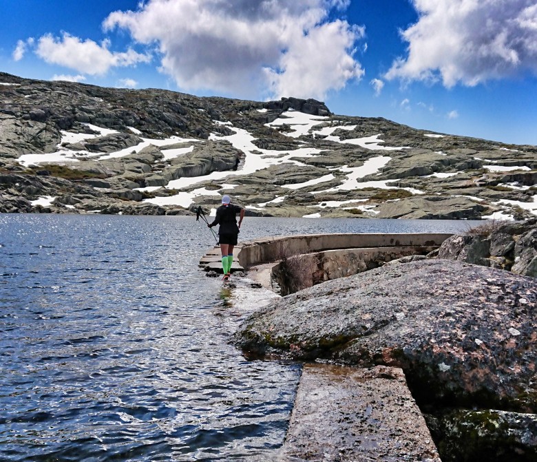 Nedför igen, det blåser lite här uppe och är svalare men är inte direkt kallt, behaglig sommarvärme lite under tjugo grader. Ett fåtal molnsuddar har börjat bygga ihop sig men övervägande soligt. Nedför springer jag lätt och kan surfa på ett par långa snölegor med exakt rätt bärighet – har riktigt bra fart nedåt. Så kommer vi ut på en väg för en kort stump asfalt och så vidare nedåt på en smal stig högt uppe på bergssidan. Det går på skrå nedför och är bitvis lite stökigt och jag känner mig lite lättad när vi kommer ut på platt och lättlöpt gräsmark på dalgångens botten efter ett tag.
