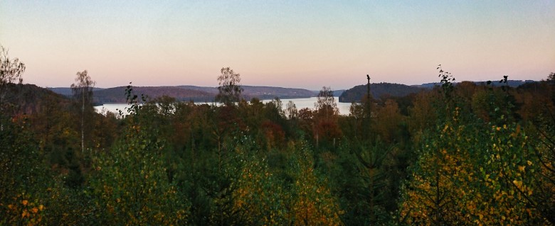 Lätt jogg upp till Fjärås bräcka och Hallandsleden, från den här ingången får vi med den fantastiskt vackra utsiktspunkten Svalhögen som blir en nyhet i bansträckningen. Brant uppåt sen underskön löpning på en kam innan det bär nedåt igen. Denna gång med fikastopp tillsammans med Hustrun på Naturumfiket. Gott och vederkvickande. Dröjer mig kanske kvar väl länge i det trevliga sällskapet och i kvällssolen för när jag kommer iväg igen är skuggorna långa. Snart nog pannlampa på och sista dryga milen kör jag i lurvigt höstmörker med en blek gul måne lågt på horisonten. Lövprassel underfötterna och skuggor som dansar i lampan. Jag glömmer ofta att jag gillar den här delen av Hallandsleden. Den är naturskön och omväxlande, ganska långa lättlöpta partier på skogsvägar som växlar med lite mer teknisk stiglöpning i djup urskog. Till slut trillar man ut i motionsspåren vid Bunketorp, Lindome och får lite lätt och platt cykelbanelöpning in till centrum. Här avslutar jag det här passet, efter 43 kilometer. Franks korvkiosk har förtjänstfullt recoverykorvarna färdiggrillade och jag hinner lagom fylla på lite innan pendeltåget som tar mig tillbaka till Kungsbacka är på plats. Hustrun har passande nog parkerat bilen vid stationen där så det är bara att rulla hemåt sen.