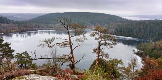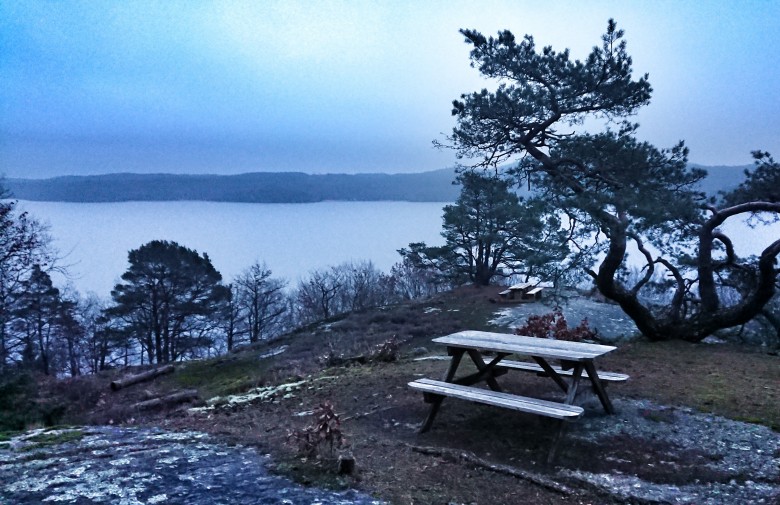 Baksidan av Texelberget är en skogsväg som idag är lite stökig, man har plockat ut skog och röjt i området och det ligger grenar och kvistar utlagda för att reda upp skogsvägen, så man får hoppa lite. Trötta ben så det går inte så fort nedför men framåt framåt och vid Helsjövägen kommer jag åter in på Hallandsleden, nu norrifrån ner mot Stättared. Den karaktärsdanande vägen genom kraftledningsgatan återstår, kraftigt upp, ned, upp och ned igen, åter på blöta stigar. Från Björnåsen är det grusväg och nedför igen och det är frestande att stanna på grusvägen till Stättareds gård då klockan är skymning och de stilpulerade tre milen kommer att nås hur som. Men jag inser att det vore helgerån att springa ett helt varv runt Stora Hornsjön utan att passera de läckra utsiktshöjderna på sjöns västsida. Så jag biter ihop och svänger vänster ner till vindskyddet och gör mig omvägen över de fina stiglöporna längs sjön och upp på bergknallarna högt ovan densamma. Dagens sista foto i dagens sista ljus på knölen ovan sjön och sedan är det bara sista kilometern kvar upp till Stättared igen.