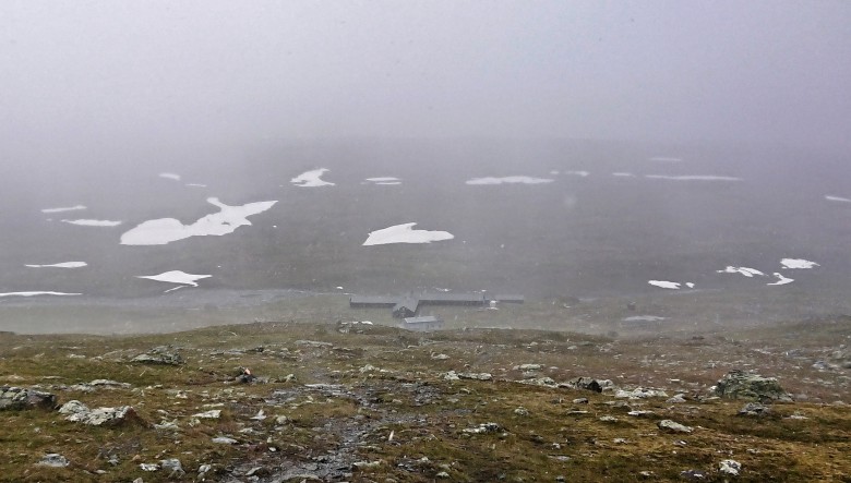 Frukost på fjällstationen vid Helags; god natts sömn men vädret ser fortsatt eländigt ut. Fortfarande manglade quads men det kändes framåt eftermiddagen igår att det inte fanns några kroppsliga problem egentligen, mer att betrakta som träningsvärk från cykelpassen och något jag nog kan jogga ur kroppen. Försöker springa med extra korta och lätta steg, både för att konservera kraft och för att ha säkerhetsmarginal mot fall och dumheter, det är långt som fan till ära och redbarhet och en räddningshelikopter vid en bruten fotled kan jag glömma under rådande förhållanden.