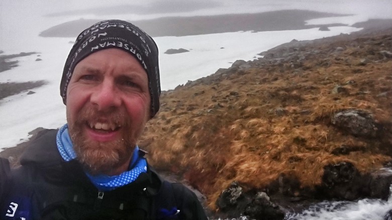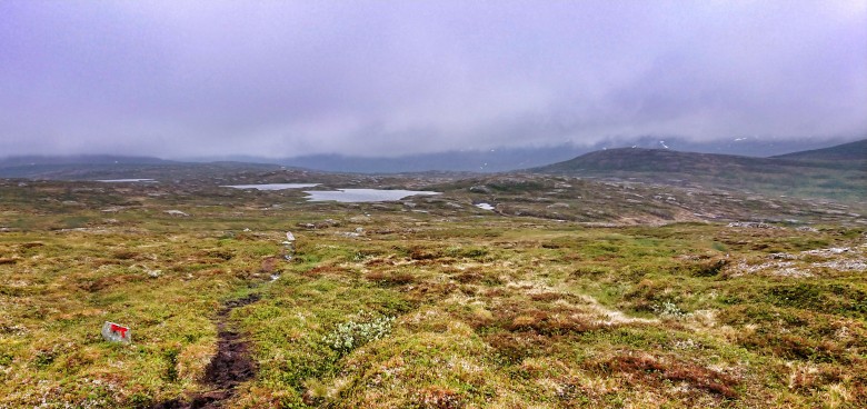 Packar på paltorna och drar ut igen, det är bara 12-14 kilometer från Rösjöhytta till Schultzhytta men jag ska in i Fongenmassivet och över ett litet pass; underlaget är minst sagt krävande på sina ställen. Tvärbäckar och en del våtmark, däremellan en del fina stigar. Gråkallt i dalgången och kylig motvind uppifrån passet, drygt hundra höjdmeter upp till högsta punkten i passet, knappt 900 meter över havet. Väldigt låga moln skymmer bergen, vilket är lite synd - det är ett riktigt fint område jag passerar igenom annars. Högst upp i passet en rejäl snölega, mycket smältvatten, kyla och lite stenskravel, sedan nedför på andra sidan. Springer och fryser och tycker synd om mig själv efter ett extra knepigt vad, möter då en familj med två barn som likt nidbilden av stjärnögd norsk familj på tur med raska steg plöjer över stock, sten och bäck. Tänker att jag får skärpa mig lite och springa på istället för att gny.