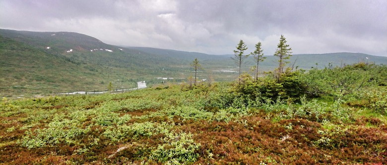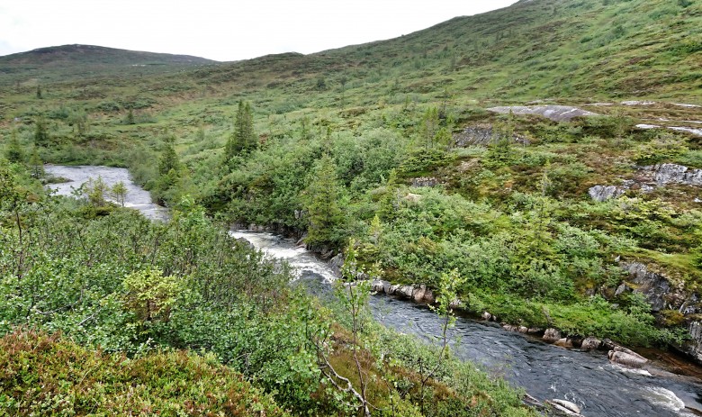 På papperet ser det ut som bra led, upp ur dalen och visserligen ett väl tilltaget antal höjdmeter men sedan löpning uppe på berget vilket borde innebära mer av stig och mindre av våtmark. Framåt femtiden är jag torr och varmare, dessutom verkar det ha slutat regna, så jag drar ut igen. Det går leder åt flera håll från den här knutpunkten mitt inne i Skarvans och Roltdalens nationalpark och jag ser noga till att jag kommer iväg på rätt led. Snart nog uppför och jag får fina vyer både bakåt över Fongen och övre Roltdalen och framåt mot Skarvanmassivet som jag ska runda på min väg till Prestöyhytta.