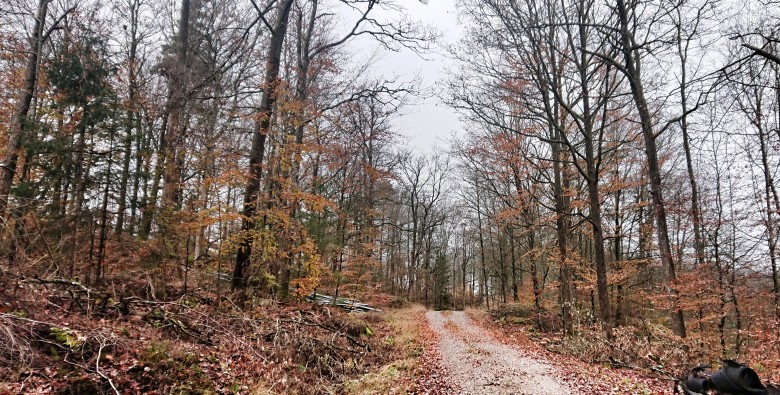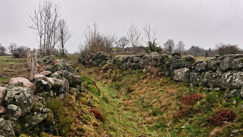 Från Helsjön bär det av nedför en kort bit sedan ytterligare en brant stigning upp på banans högsta punkt, Texelberget. Även här är den magnifika utsikten höljd i dimma så det blir till att studsa vidare direkt. Ett par kilometer snabb lätt löpning i snällt medlut innan vi svänger in på Hallandsleden. Här väntar en mil på en både kuperad och tungsprungen del av Hallandsleden, som dessutom är rejält blöt idag. Det går inte fort, men jag håller gott mod och matar på. Följer min energiplan som bygger på en shot med 4 cl stark-Umara varannan kilometer ungefär, lite justerat efter tempo och då och då ersatt av en gel. 4 cl i min blandning svarar mot runt 20g kolhydrat, dvs ungefär samma som en vanlig gel - men mindre krångligt. Vatten dricker jag efter törst. Den här delen av banan är det som närmast hem och jag kan den bara allt för väl. Faktum är att det är klart närmare hem än det är till målet, tur att jag måste till Sätila för att hämta upp bilen annars hade lockelsen varit stark att springa hem och ta en varm dusch istället. Fötterna känns svampiga och när jag kommer ut på fast mark innan Äskhult känner jag tydligt att leran som sedan länge trängt innanför strumporna har format ett veck under trampdynan. På sikt blir det oundvikligen blåsor av sådant, som tur är finns min dropbag i Äskhult och här har jag torra strumpor och skor att byta till. Dessutom vet jag redan att kommande del av banan är torrare. Upp genom fägatan till toppen av drumlinen där den fina fyra stugor stora förskiftesbyn ligger, högt och vackert. Dimmorna har lättat men himlen är fortsatt lika grå som marken är grant färgskiftande i allt från knallgrönt till sprakande rött. Temperaturen ligger stadigt på 5-6 grader och jag växlar mellan att ha armvärmare nedkavlade och uppdragna, och de löst sittande merinovantarna på eller av, men det är lättreglerat och okomplicerat. Inget regn, ingen vind.